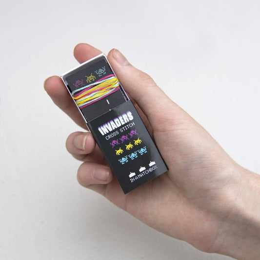 Space Invaders Mini Cross Stitch CMYK Kit in a Matchbox
