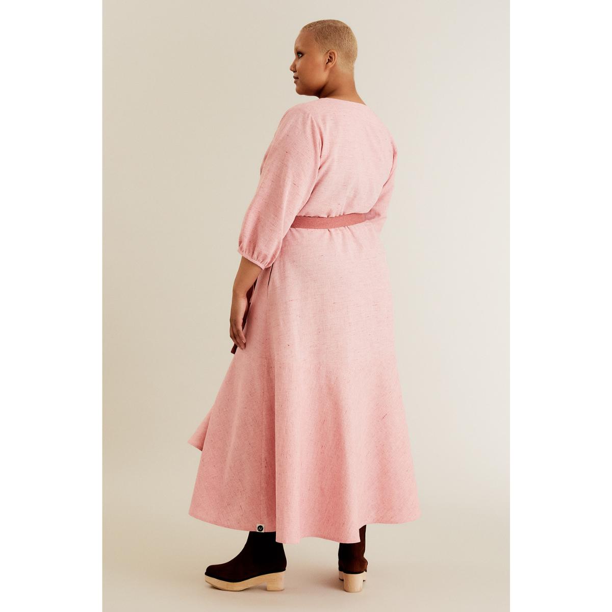 The Hali sewing pattern includes two comfy and stylish wardrobe staples: A wrap dress and jumpsuit. Both variations feature a semi-fitted wrap bodice with a back yoke and a V-neck, wrap tie closure, and handy side pockets. The dress comes with a voluminous, ankle-length circle skirt and ¾-sleeves with gathered sleeve openings. The midi-length jumpsuit has an interesting construction that is a hybrid of a dress and a jumpsuit. The jumpsuit variation includes simple T-shirt sleeves.