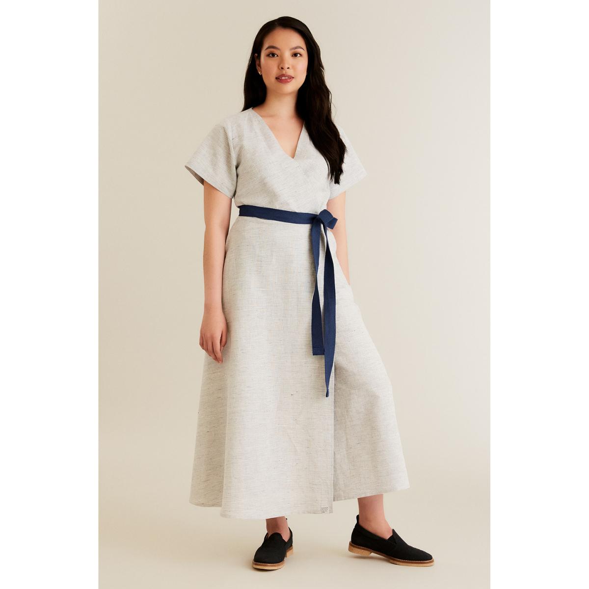 The Hali wrap jumpsuit sewing pattern is a comfy but stylish wardrobe staple that features a semi-fitted wrap bodice with a back yoke and a V-neck, wrap tie closure and handy side pockets. The jumpsuit comes with T-shirt sleeves and a midi-length bottom part that is a hybrid of a dress and a jumpsuit.