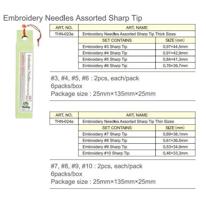 Tulip's superior quality embroidery needles, also known as crewel needles, are perfect for hand embroidery. The elongated eye of the needle is designed to accommodate thicker thread or strands of floss. The gold-plated eye is easy threading and polished thoroughly to prevent snagging. Tulip needles embody the marriage of precision technology with 65 years of traditional needle production.