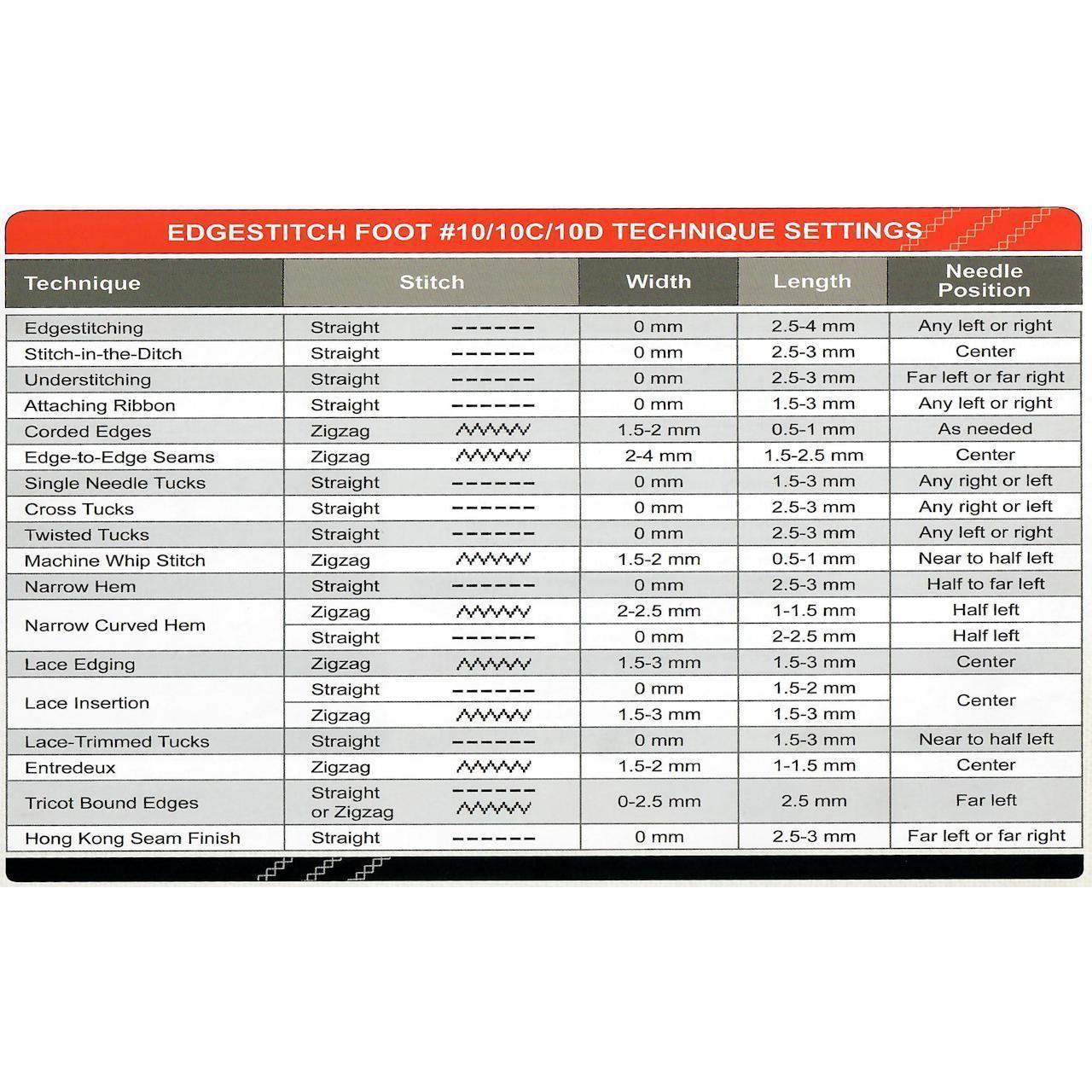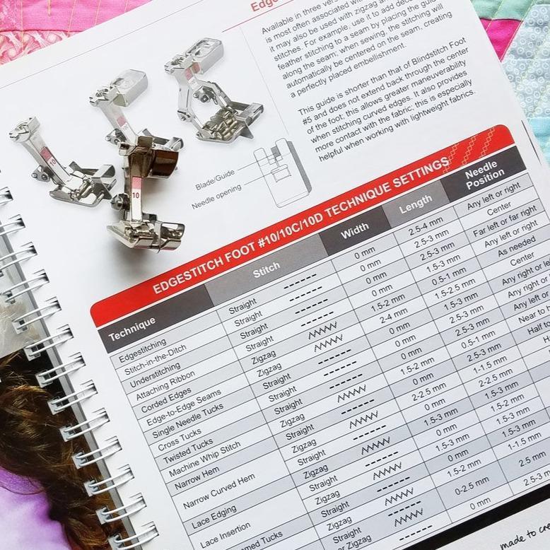 Feet, Accessories, and TechniquesThe 250 pages of this book covers all current BERNINA presser feet and accessories with techniques, from appliqué to zippers. Find out how these feet work and why they do what they do. Most presser feet were designed for a specific reason but often have multiple uses, making them even more valuable in your sewing room. Each presser or accessory has a Technique Settings chart. The chart gives you an at-a-glance look at the settings needed for the techniques specific to the foot. Spiral-bound, the book lays flat when opened, making it useful to keep by your sewing machine. This is especially helpful when using an unfamiliar presser foot or accessory.