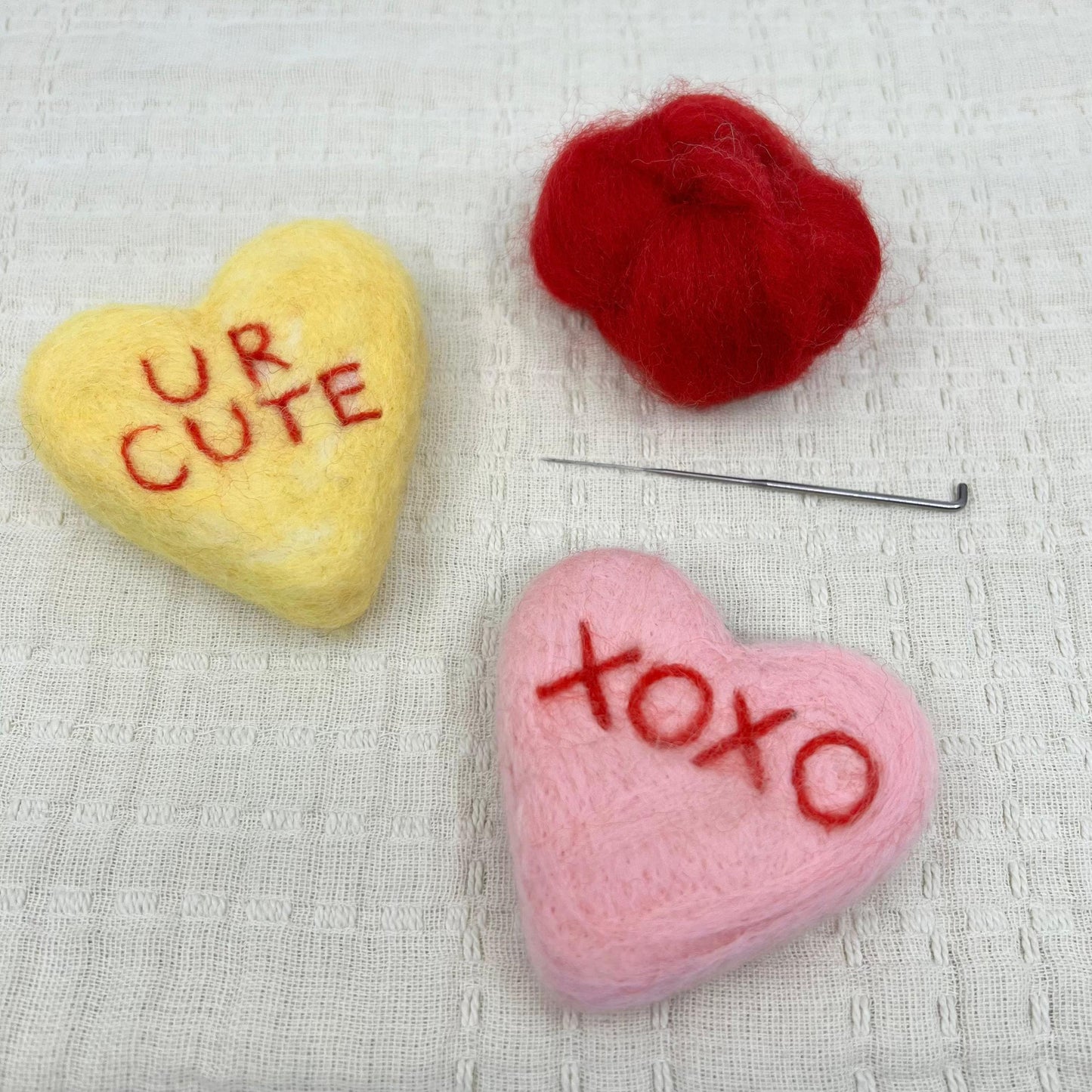 Love is in the air! Our Conversation Heart needle felting kit is great for home decor, gifts for pals who don't like candy, and with so many messages you can build up quite the collection. Suitable for beginners and above, learn to make a conversation hart and then embellish with text or even a face!