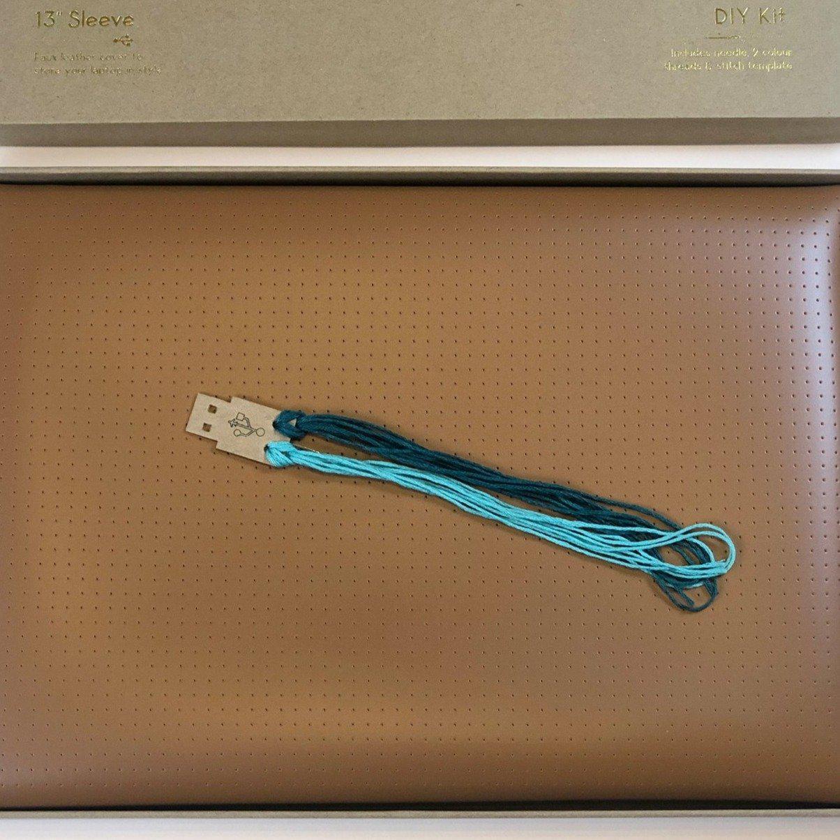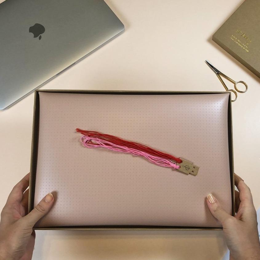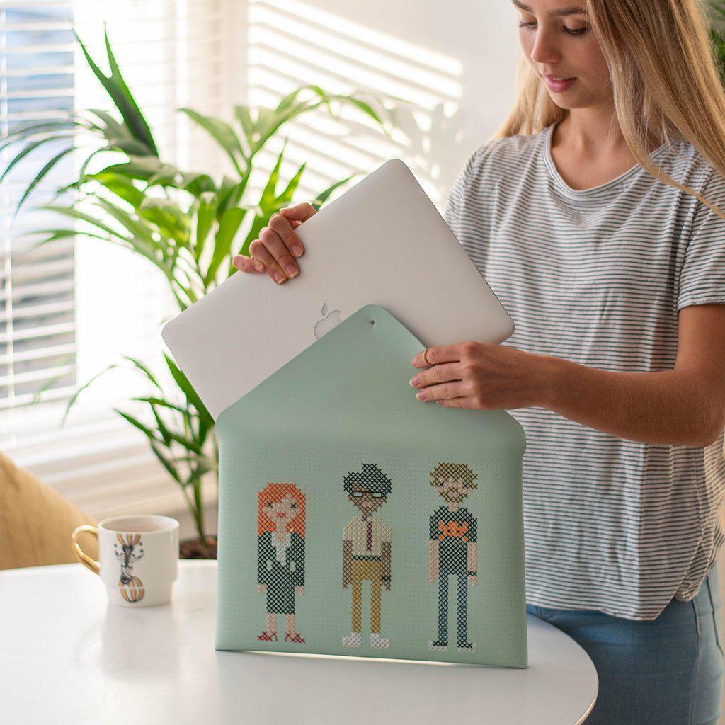 The laptop sleeve is perforated all over, designed as a cross stitch kit to be sewn and personalized with the threads included. The envelope style pouch opens out fully so it can be stitched all over with any cross stitch design. Sew your own initials in 3D monogrammed font to create an easy personalized cover that is totally unique.