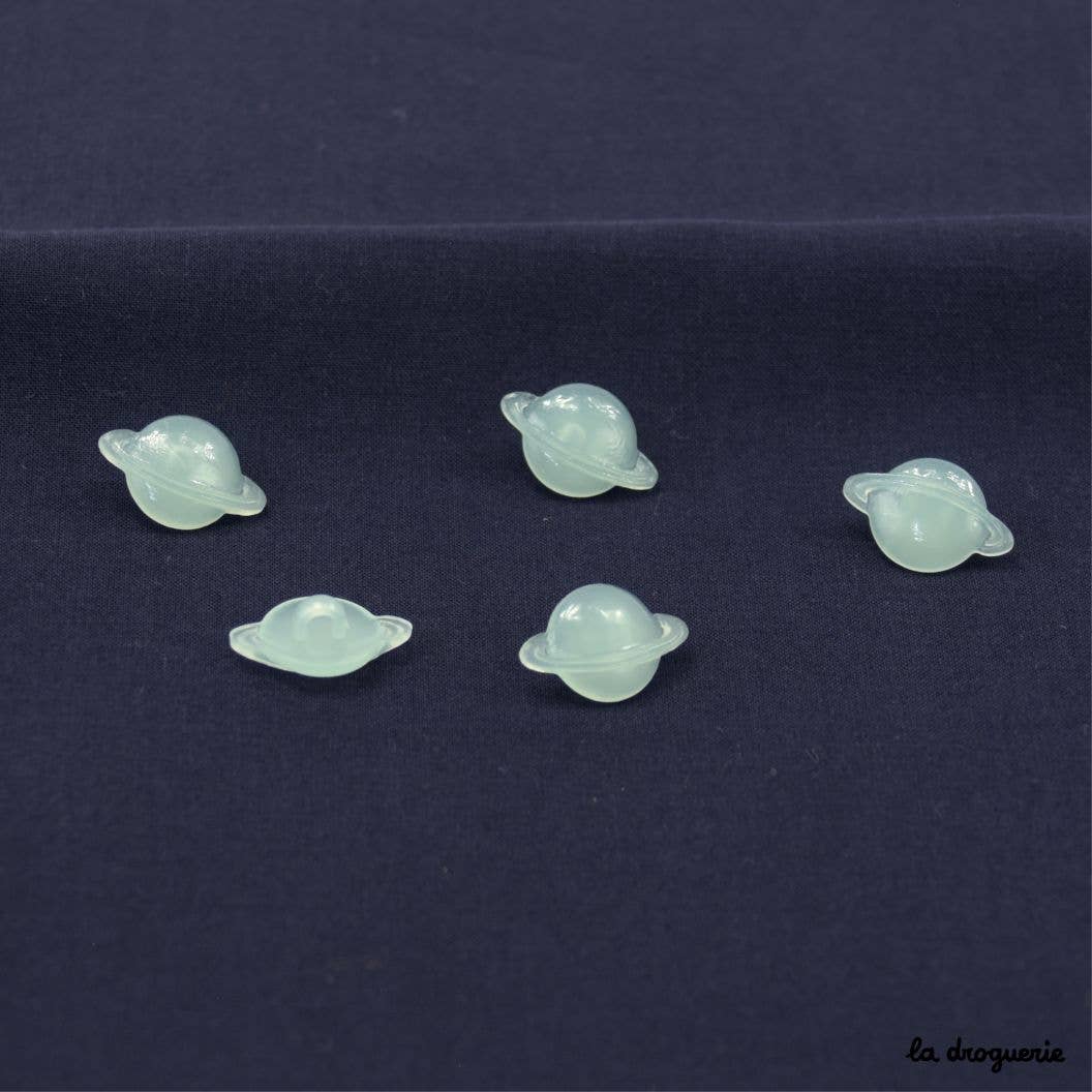 Dimensional button in the shape of a phosphorescent planet, and yes, it glows in the dark! Button with shank, for easy sewing onto clothes.
