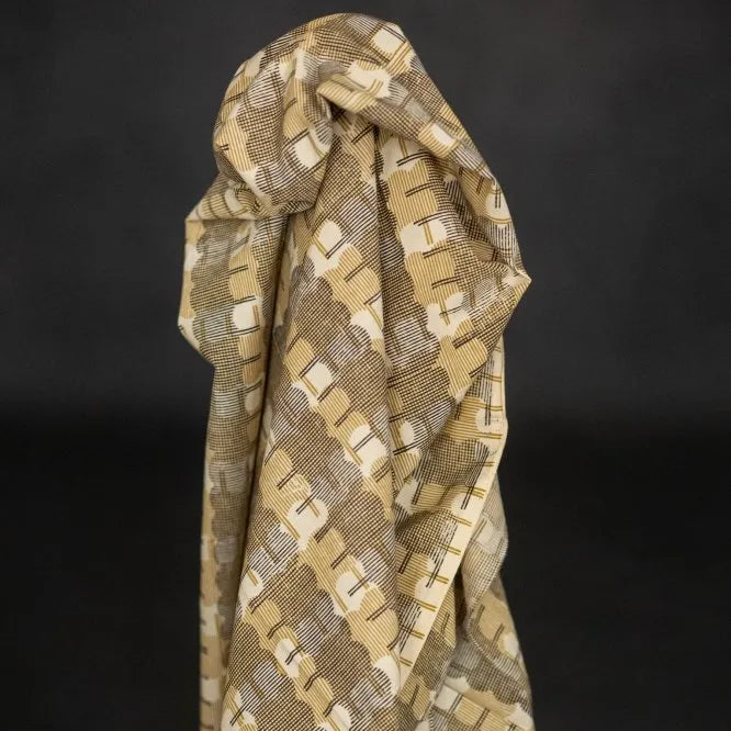 A geometric Bagru block print in classic black and mustard yellow. Bagru, a small village in Rajasthan, 22 miles from Jaipur, is known for its hand block printing utilizing traditional processes and natural colors. Bagru prints tend to be more simple with limited colors in comparison to Sanganer block prints which are more colorful with finer detail. Block printing is still practiced by the Chippa community, who have lived here for over 400 years.