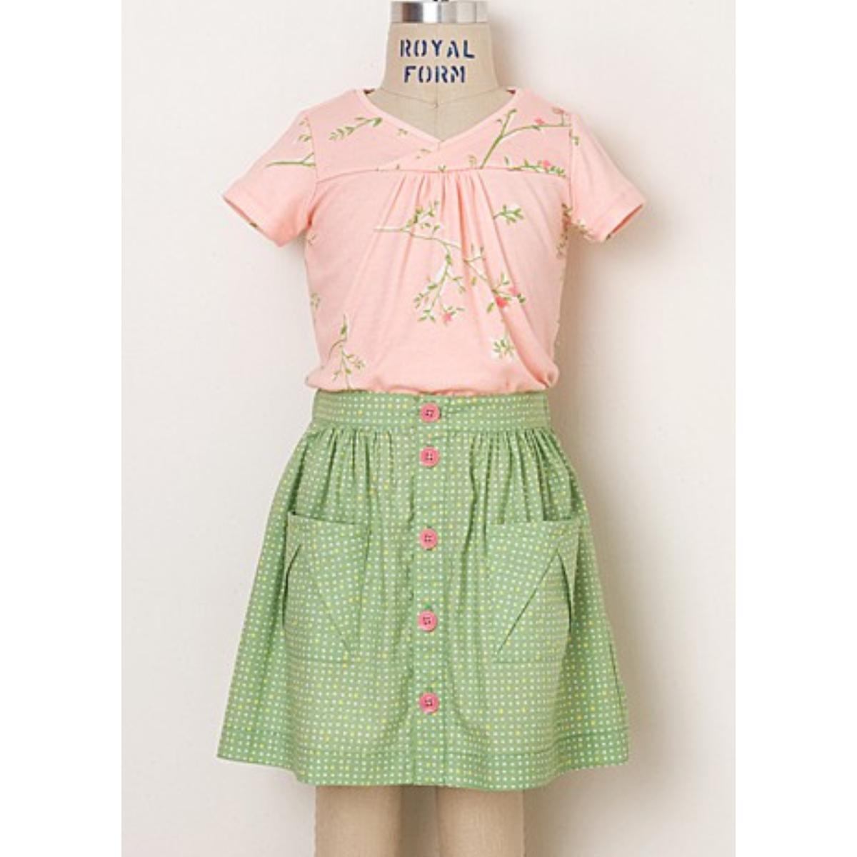 It's your turn to play. This girl's skirt, knit top, and knit dress pattern features a gathered skirt (designed for woven fabrics) with elastic-back waistband, front button placket, and an interesting pocket detail inspired by the shape of a takeout box.