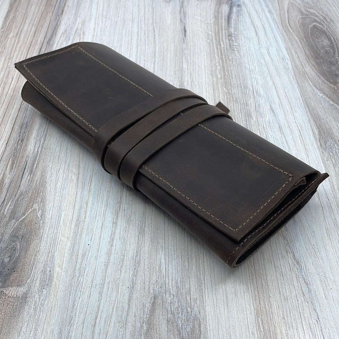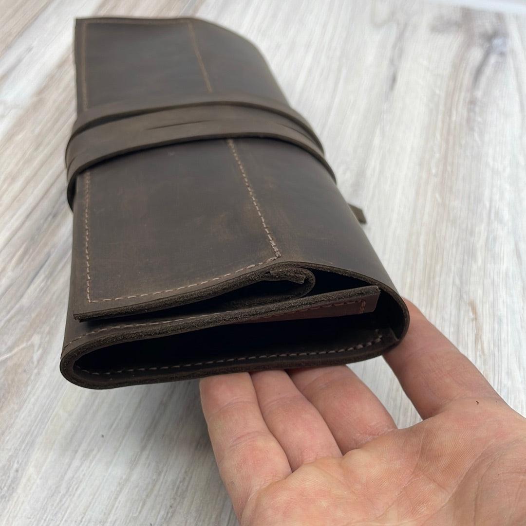 Handmade from genuine leather in Ukraine, this sturdy roll-style case helps keep all of your knitting needles and notions organized!