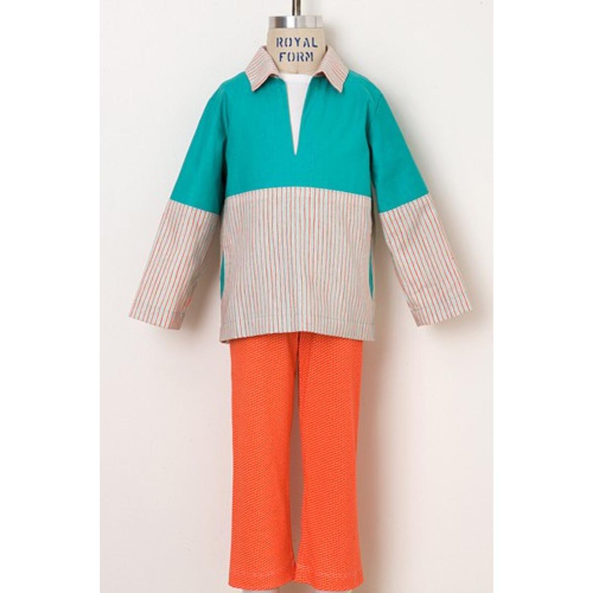 Let's take a stroll outside. This boy's or girl's casual pull-on top and knit pants pattern features an easy-to-sew, casual, color-blocked pullover designed to be sewn in woven fabrics. The top can be made in lightweight fabrics for a casual shirt or in heavier fabrics for use as a layering piece in place of a sweatshirt or jacket. The pull-on knit pants have a hidden elastic waist and are designed for knits with at least 25% stretch.