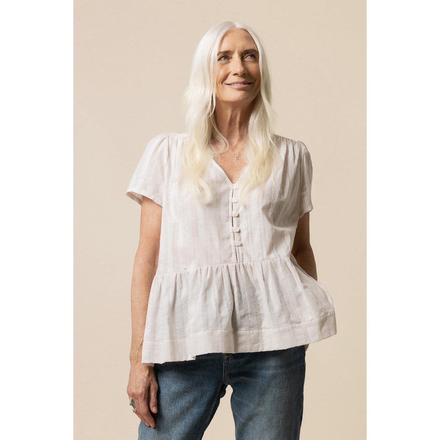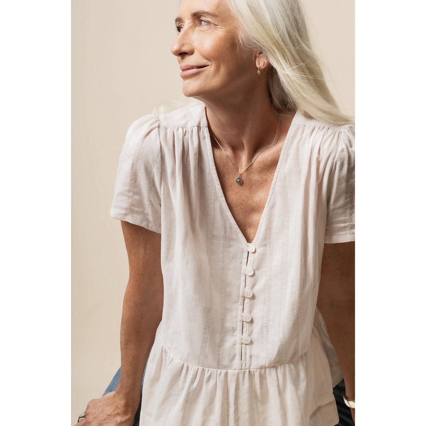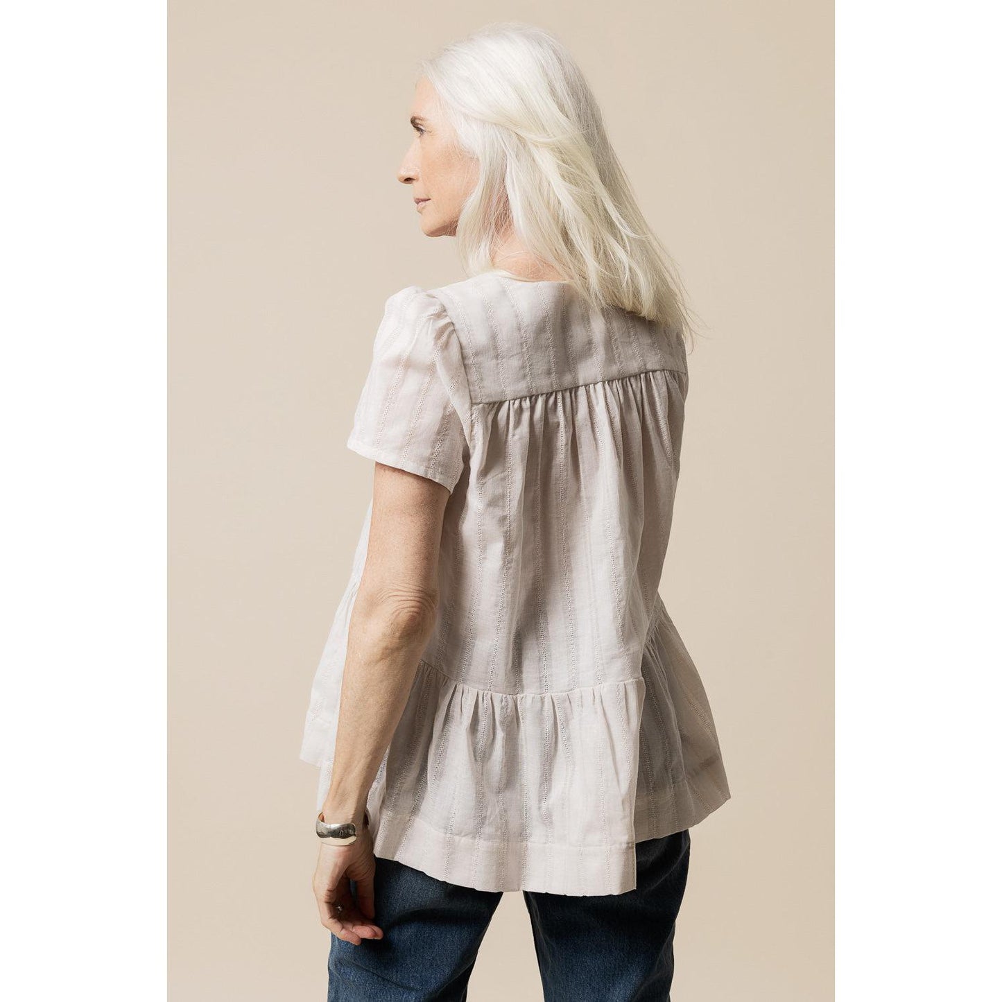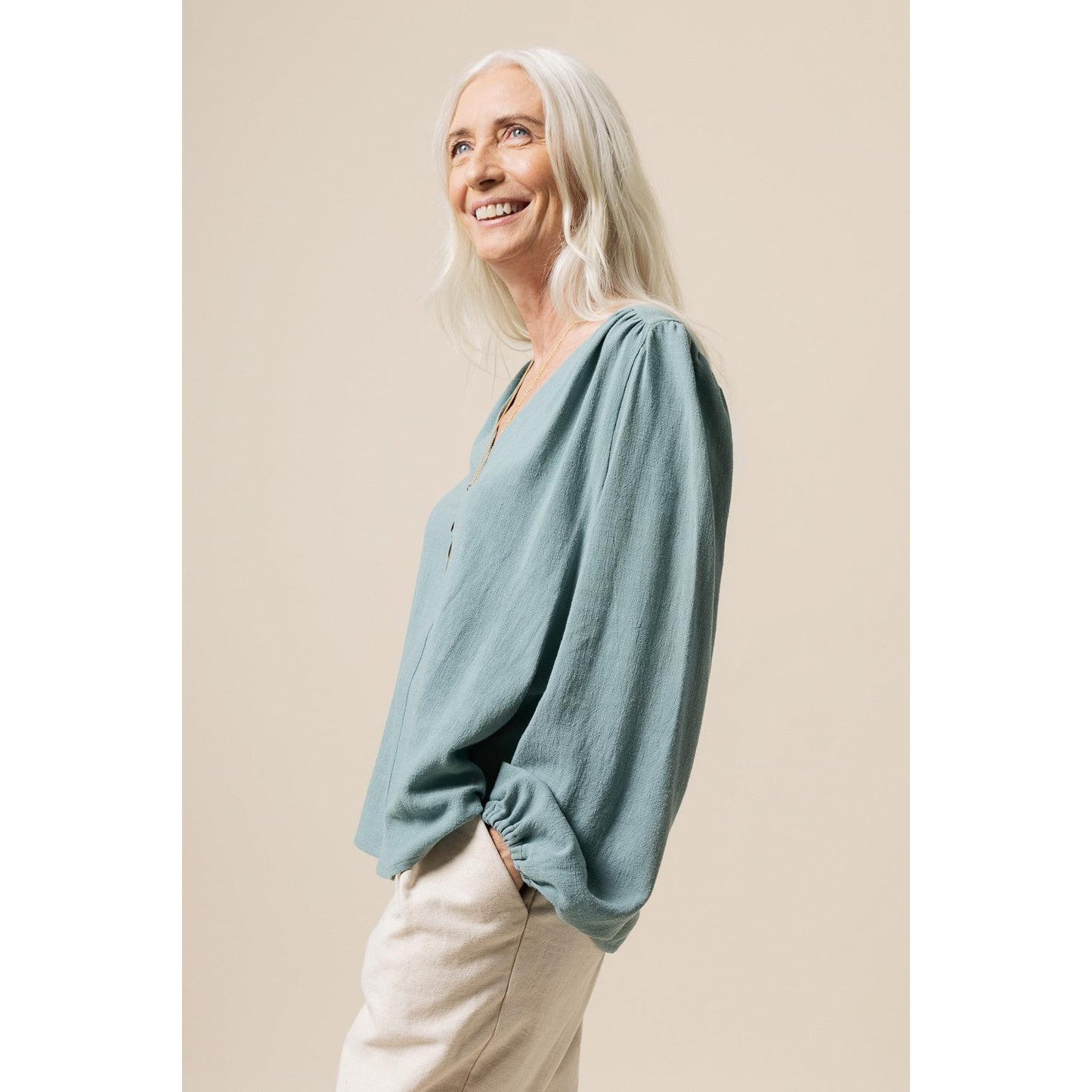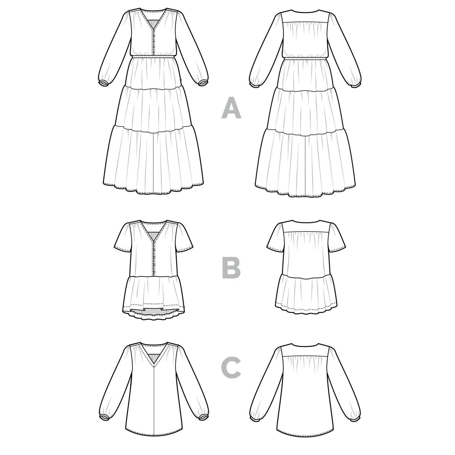 All views feature a loose-fitting V-necked bodice with a gently gathered shoulder and yoke. The slightly puffed sleeve is gathered at the shoulder; choose between a short sleeve, or a long sleeve with wrist pleats for shaping and an elastic gathered cuff. You may also choose between two interchangeable neckline finishes: a simple facing, or a bias-bound neckline with delicate rouleau button loops and buttons. View A is a button-front dress with a comfortable elastic waist, long or short sleeves, and three gathered skirt tiers. View B is a voluminous swing tunic with a gathered hip tier and long or short sleeves. View C is an elegant blouse with a faced neckline and long or short sleeves.