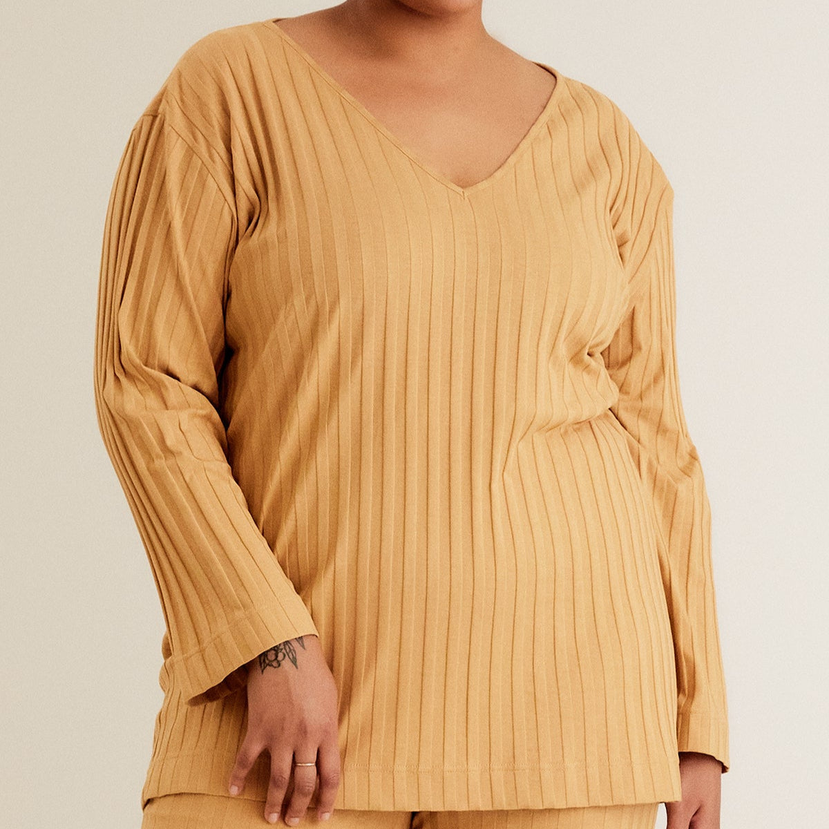Olo is a relaxed but elegant long sleeve tee. You can sew this easy straight-cut T-shirt as either a dainty rolled-hem funnel neck, or a deep V-neck with binding. The blouse hem and sleeve openings can also be finished with a rolled hem or a simple turnup.