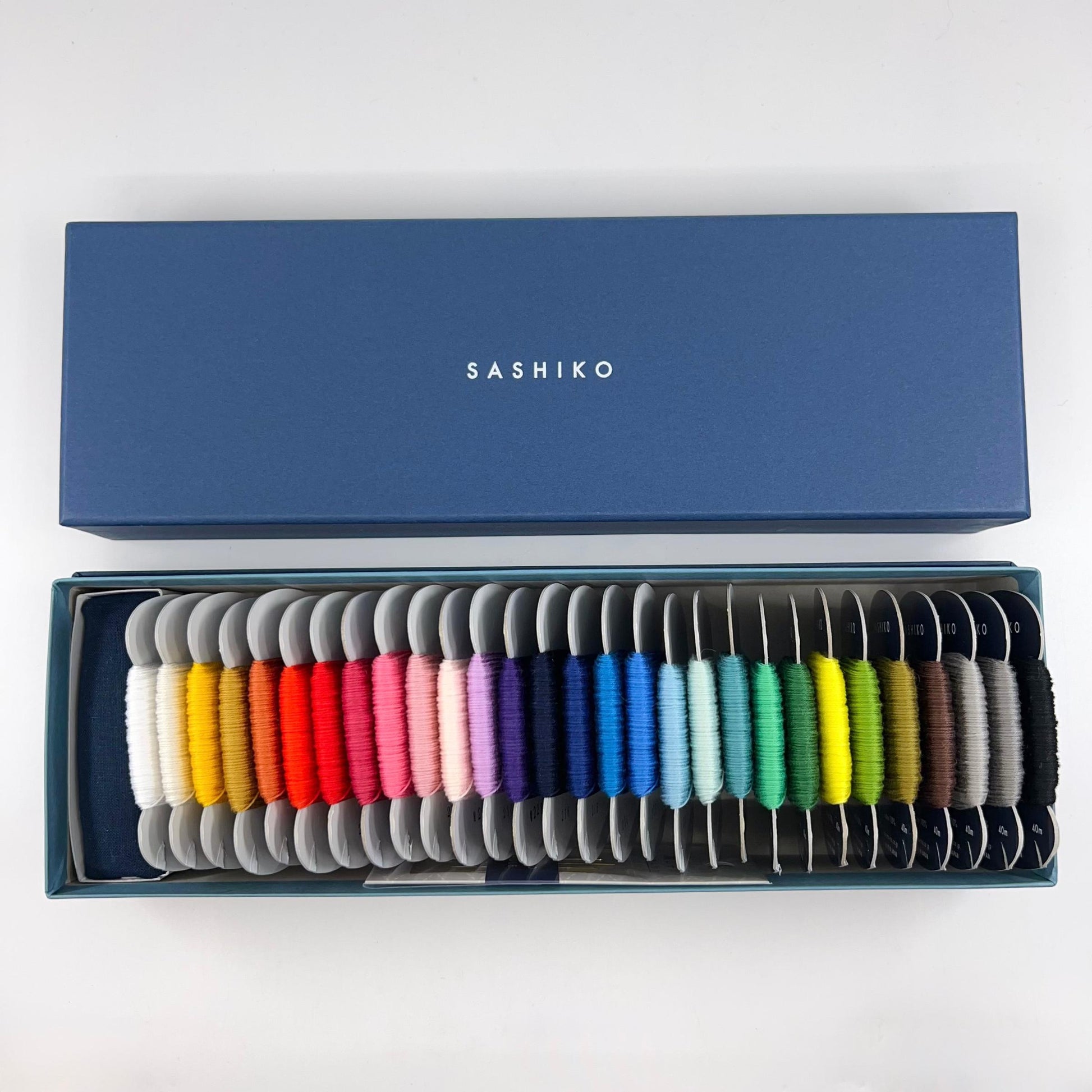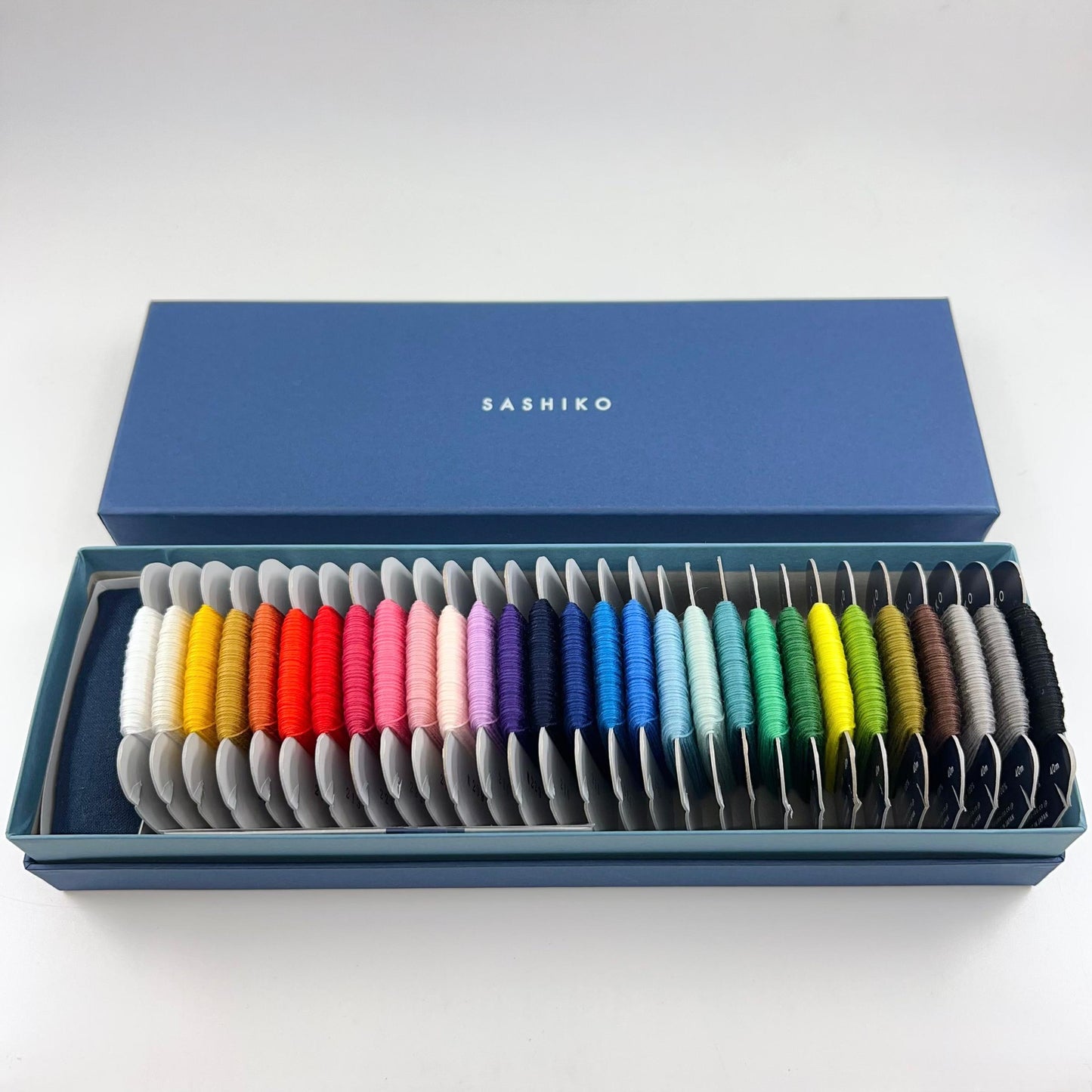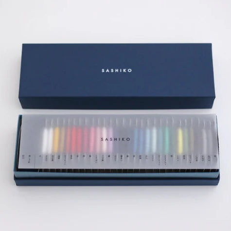 The Large Sashiko Thread Box contains 29 colors (1 each) of Sashiko Thread Cards - Thin (20/4):