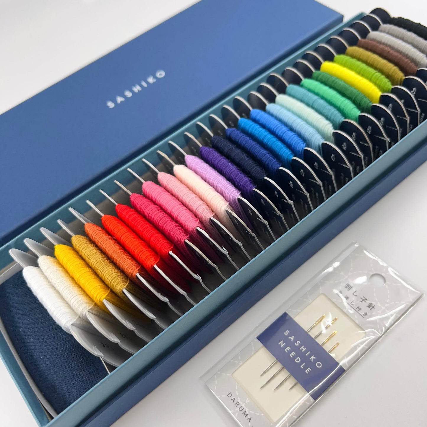 Like choosing colored pencils, you can select which color of DARUMA Sashiko thread to use from the entire color palette. The box sets include a set of Sashiko Needles and a pin cushion, and the gift box can be used to store the collection.