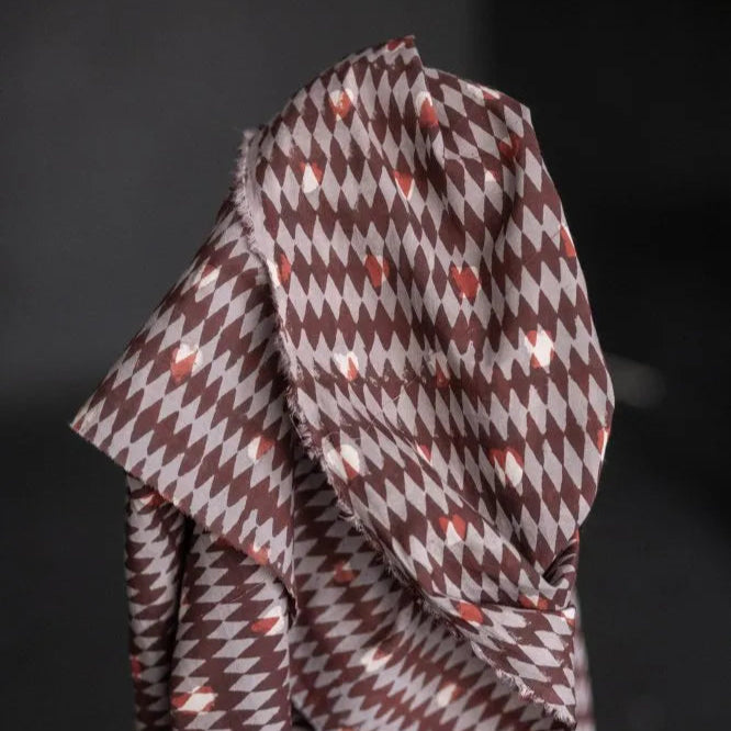 A bold diamond Indian block print in dark burgundy red and grey-ish purple on organic cotton.